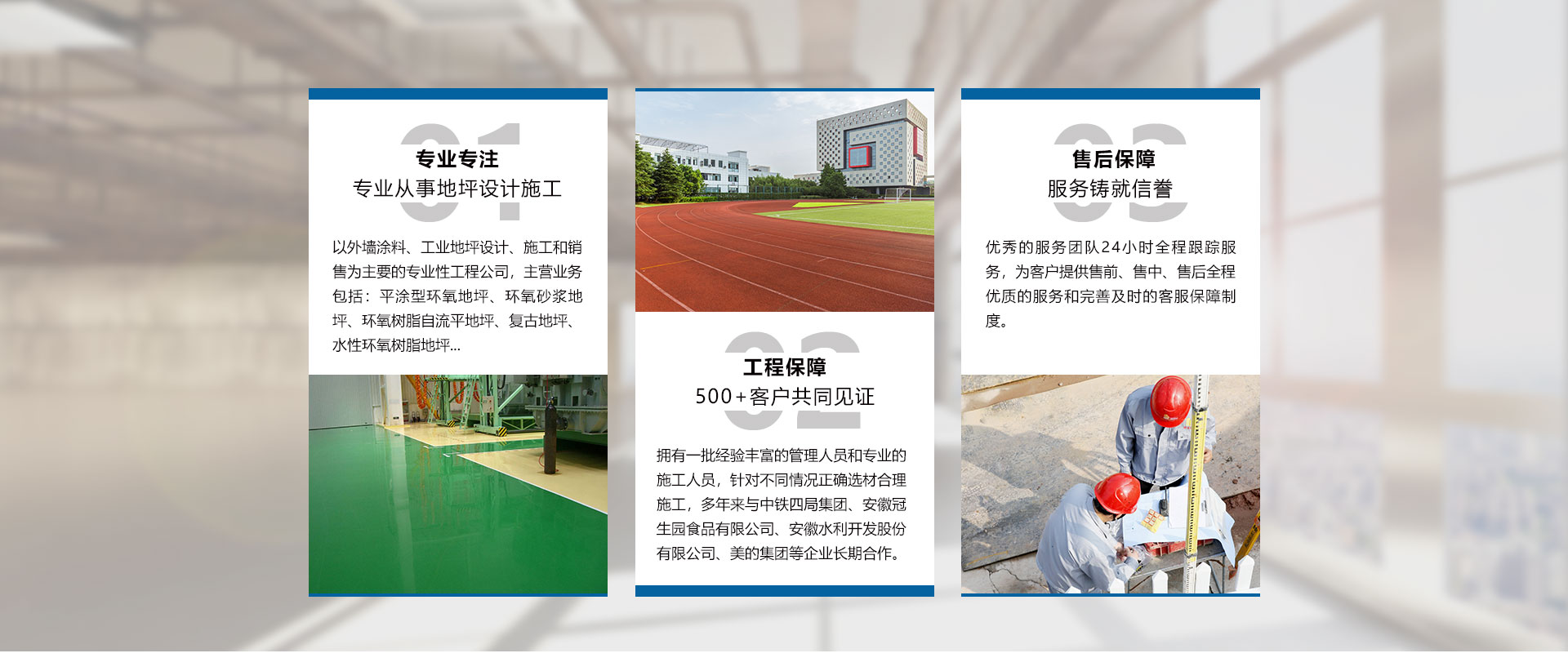 安徽世博裝飾工程有限公司成立于2009年,是一家以外墻涂料、工業地坪設計、施工和銷售為主要的專業性工程公司、是工業地坪施工的專業企業。公司設立了售后服務中心,用戶遍布全國大中小城市,一大批具有標志性的長期合作伙伴?!笆啦┕尽杯h氧地坪工程,受到了越來越多的不同行業用戶的好評及青睞。公司擁有一批經驗豐富的管理人員和專業的施工人員,以保障產品的成功應用,用較小的代價獲得理想的效果,尤其在地坪涂裝方面優勢突出。而且以好的品質管理模式,向客戶提供“獨具魅力”、“性能優異”、“質量穩定”的產品。公司主要產品包括:平涂型環氧地坪、環氧砂漿地坪、環氧樹脂自流平地坪、滾涂型防靜電地坪、自流平防靜電地坪、復古地坪、水性環氧樹脂地坪、彩色透水混凝土地坪、壓花壓模藝術地坪、金剛砂耐磨硬化地坪、混凝土密封固化劑地坪、乙烯基酯重防腐地坪、GEP 標準型地坪、彈性PU運動場地坪、塑膠跑道地坪,PVC橡膠地板、停車場地坪、無震...